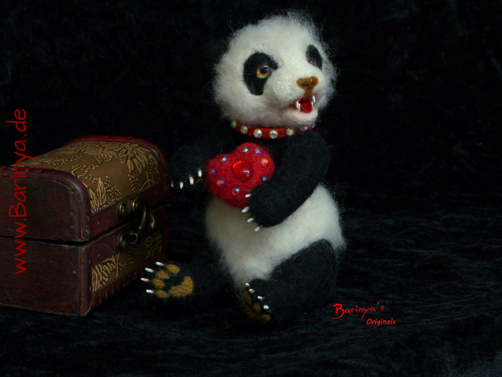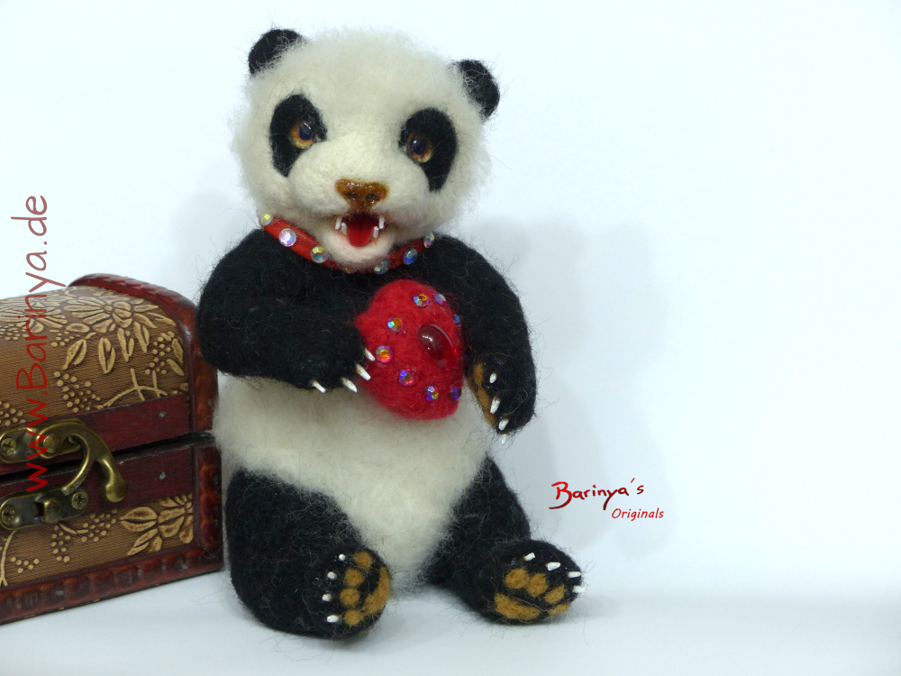 Dieser nadelgefilzte Pandabär hat ein geöffnetes Schnäutzchen mit Zunge und Zähnen, sowie Krallen. Seine Zähne und Krallen sind aus koloriertem Holz. Dieses Panda Bärchen bringt seinem neuen Besitzer ein funkelndes Herz als Geschenk mit. „Ein Herz für Dich – Panda“ ist statisch gemacht, lässt sich somit also nur sitzend präsentieren; lediglich sein Kopf ist durch ein Fadengelenk beweglich. Seine weißen Bereiche sind flauschig gestaltet, was auf dem Bild mit dunklem Hintergrund gut zu sehen ist..