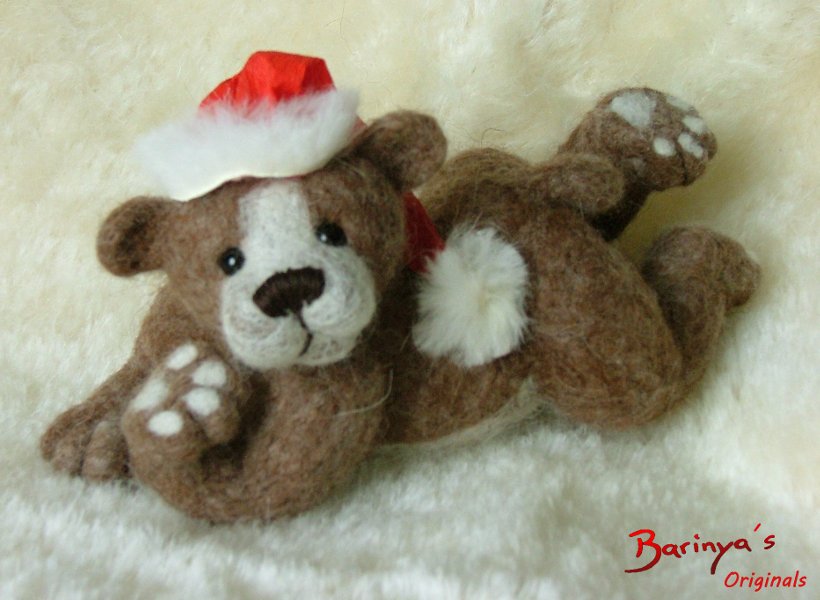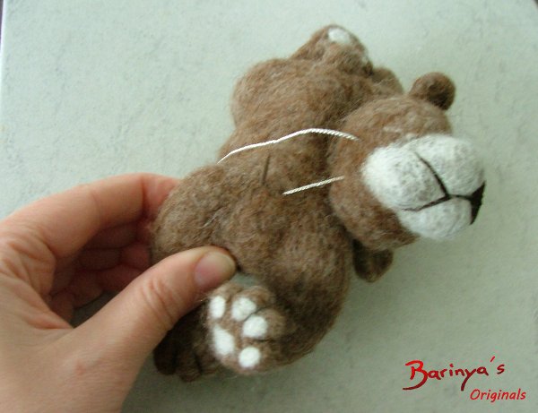 Nun ist es auch an der Zeit, anders farbige Stellen (Pfoten, oder Bauch etc.) mit kleinen Mengen weiterer Wolle an zu filzen.