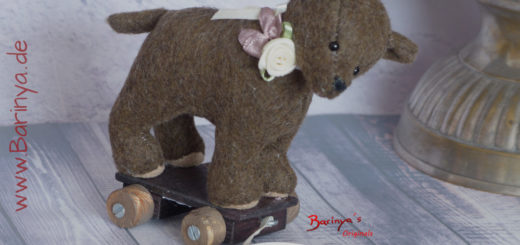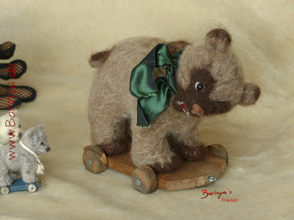 Dieser kleine Masken-Bär ist durch seine Füllung relativ schwer. Er hat ein offenes Schnäutzchen mit Zunge und Zähnchen aus coloriertem Holz. Seine dunklen Akzente sind mit Alpaca Wolle aufgefilzt…