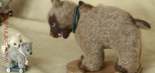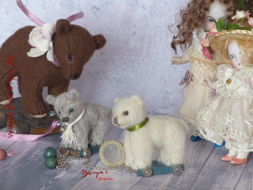 Eines meiner aktuell kleinsten gefilzten Bärchen auf Rädern. Wie klein sie tatsächlich sind kann man anhand der mit abgebildeten 1 Euro Münze.