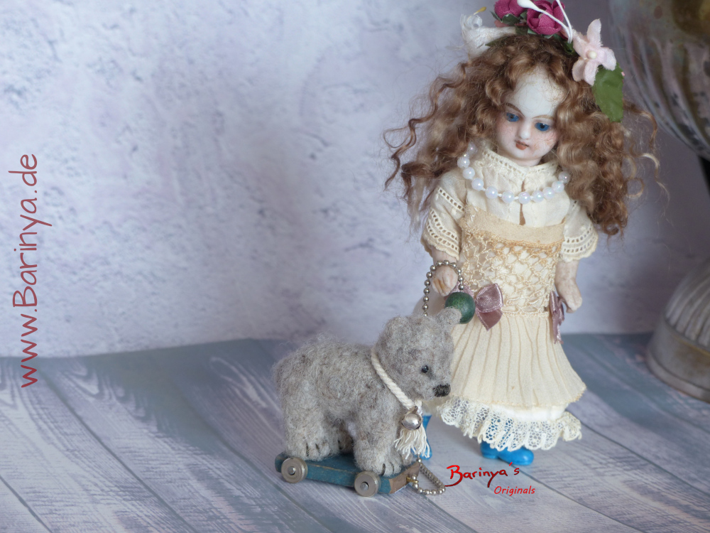 Gedacht sind die Rädertierchen als Puppen- oder Bärenspielzeug. Hier habe ich sie unter anderem mit antiken Puppenstuben-Püppchen fotografiert.