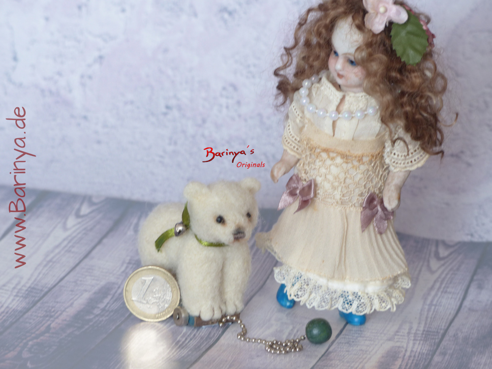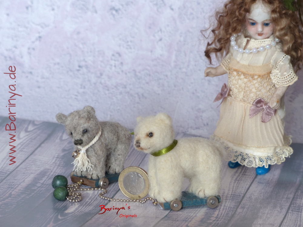 Eines meiner aktuell kleinsten gefilzten Bärchen auf Rädern. Wie klein sie tatsächlich sind kann man anhand der mitabgebildeten 1 Euro Münze erahnen.