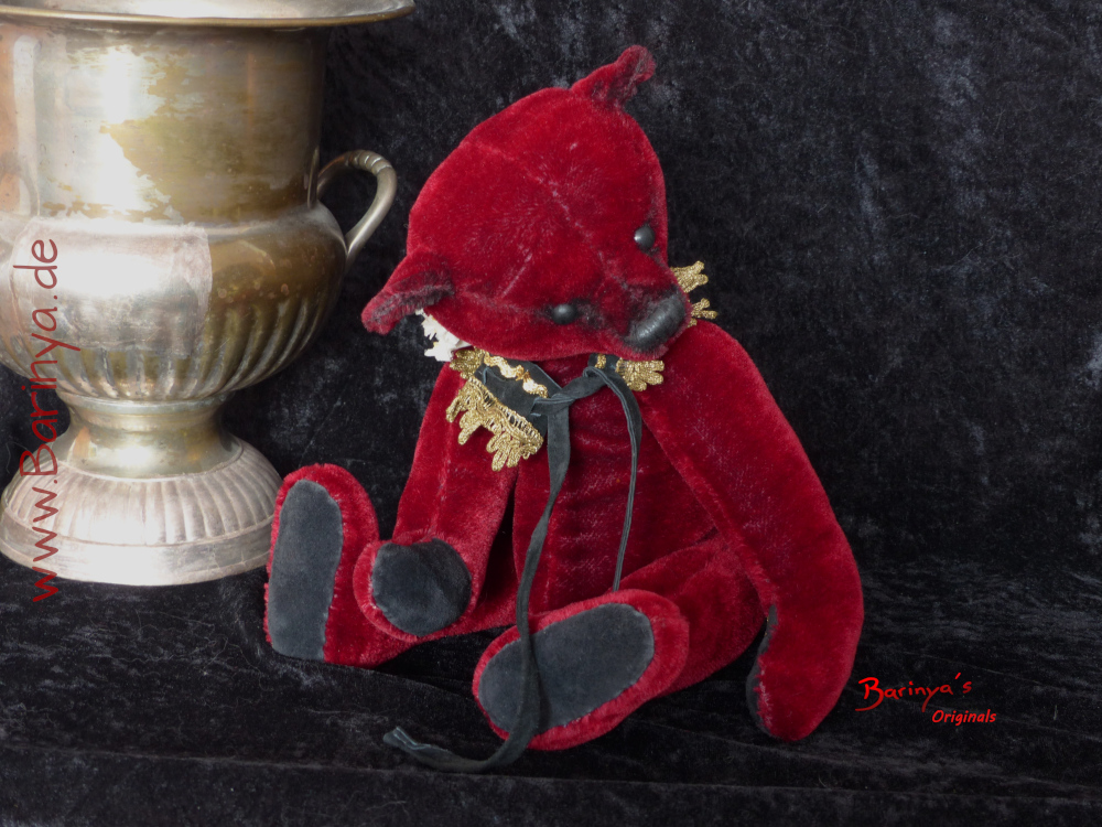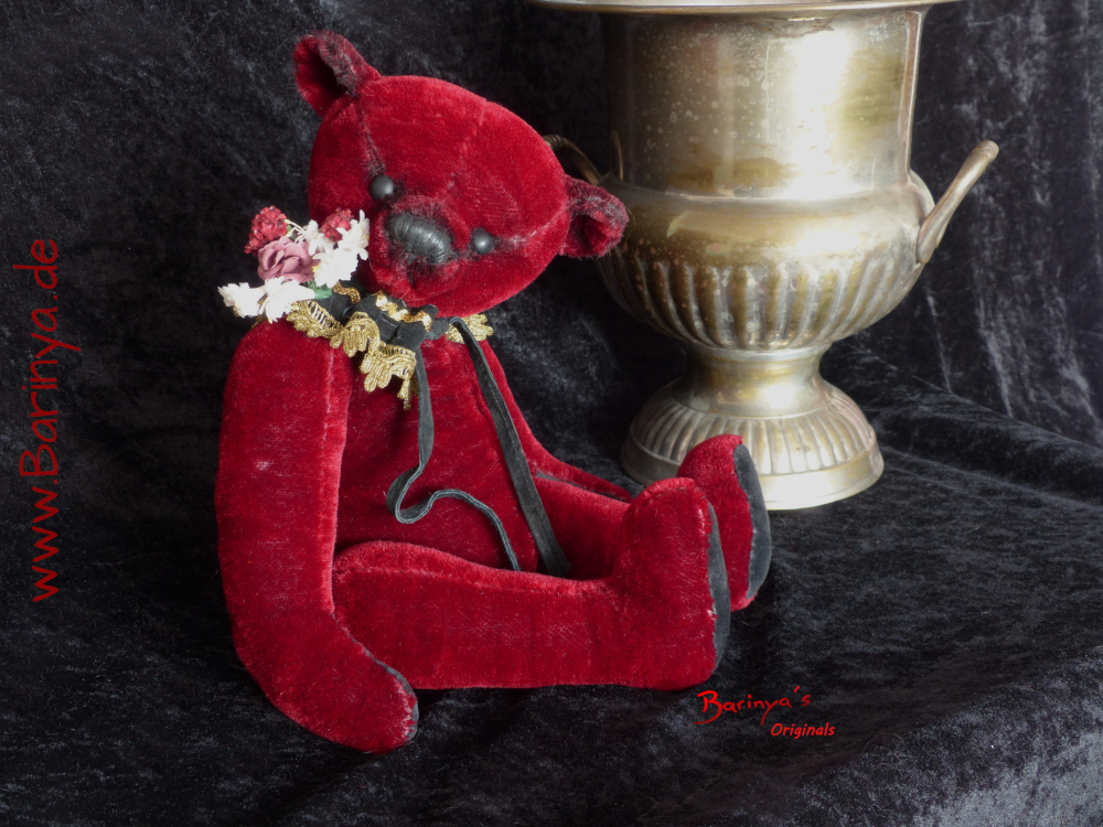 Er ist ein mittelgroßer Bär aus beeindruckendem, tief rotem antiken Mohair aus meiner „Old Style“ – Serie. Old Red ist mit 5-fachen Wackelgelenken ausgestattet, dementsprechend kann er nicht allein stehen. Sein Körper ist weicher gestopft als seine Arme und Beine und ist, auch durch sein Gewicht „knautschig“ anzufühlen. Ein sehr „alter“ Bär aus antiken Materialien, der eine Menge erzählen könnte… .