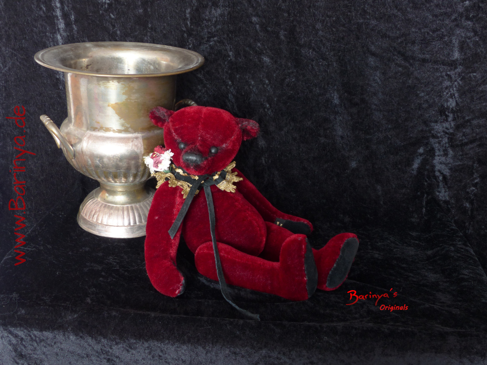 Er ist ein mittelgroßer Bär aus beeindruckendem, tief rotem antiken Mohair aus meiner „Old Style“ – Serie. Old Red ist mit 5-fachen Wackelgelenken ausgestattet, dementsprechend kann er nicht allein stehen. Sein Körper ist weicher gestopft als seine Arme und Beine und ist, auch durch sein Gewicht „knautschig“ anzufühlen. Ein sehr „alter“ Bär aus antiken Materialien, der eine Menge erzählen könnte… .