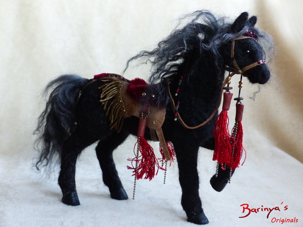 Dieser Rappe wurde trocken mit der Filz-Nadel gefilzt. Er hat eine Höhe von 24cm und eine Körperlänge von etwa 16cm.