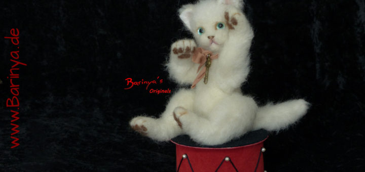 Katze Tim 16cm – sitzend 12cm Eine aufgeweckte , weiße Jungkatze die gerne auf ihrer „Trommel“ posiert. Dieses Kätzchen ist...