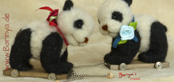 Panda Zwillinge Puppen- und/oder Bärenspielzeug ca. 7cm hoch — 8cm lang Diese zwei kleinen Panda-Bärchen auf Rädern sind nadelgefilzt und...